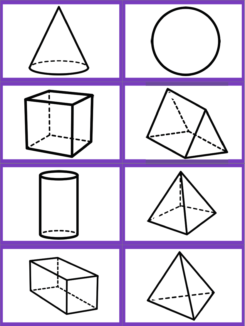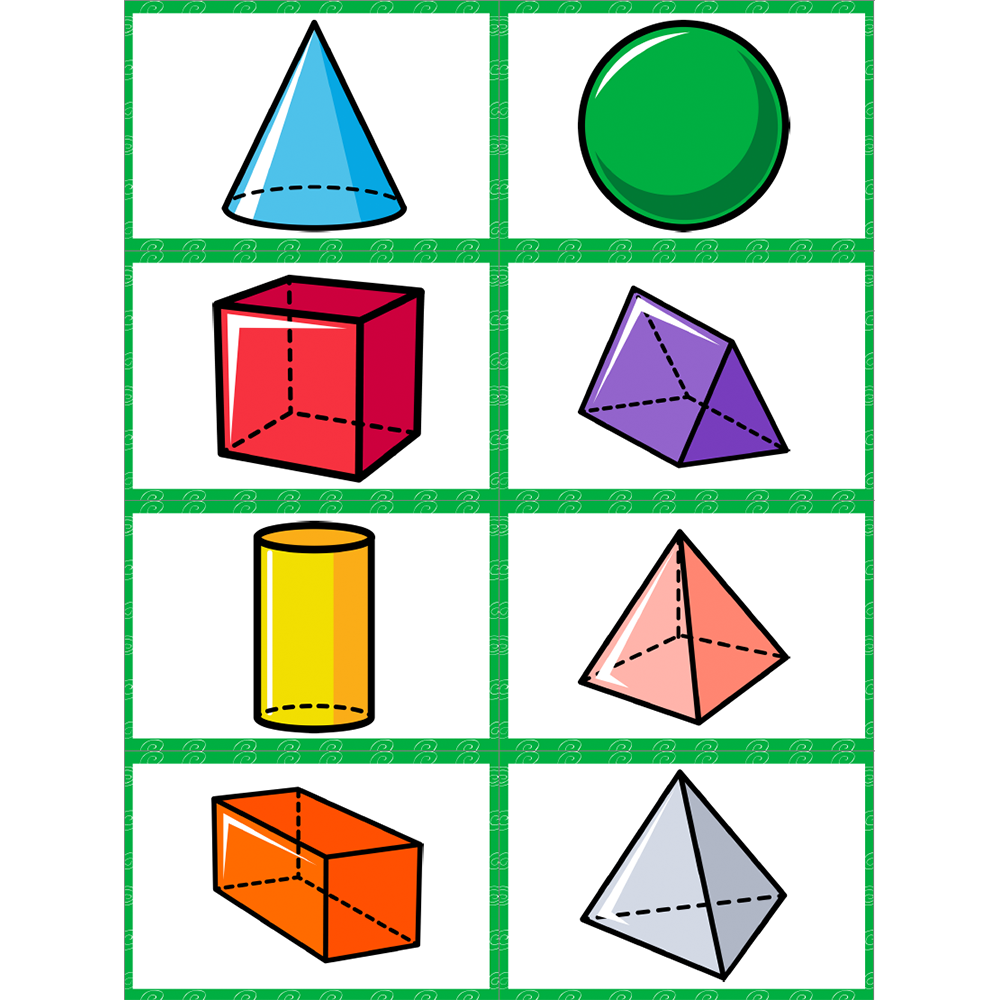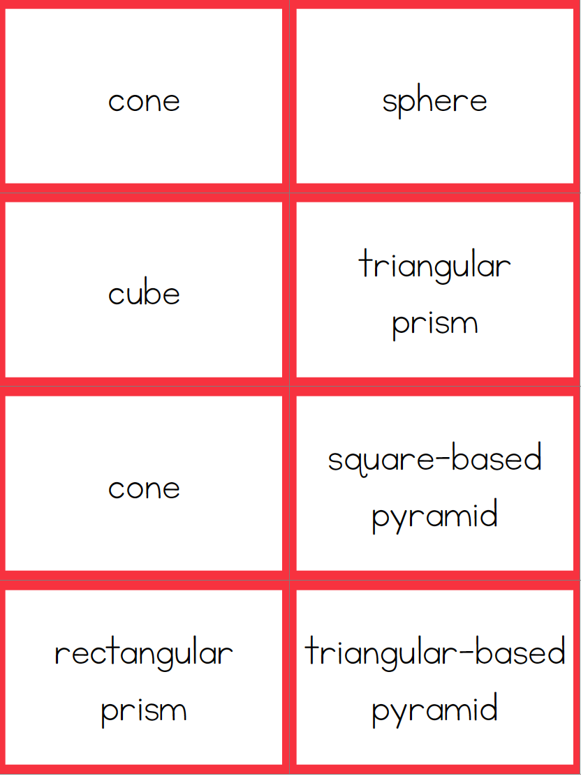 Cube, Rectangular Prism, Triangular Prism, Sphere, Square-based Pyramid, Triangle-based Pyramid, Cylinder and Cone. (alternate names: Cuboid and Tetrahedron are included as alternates.)