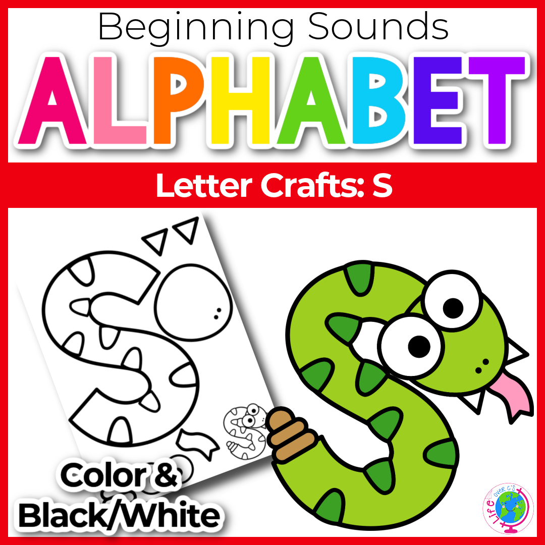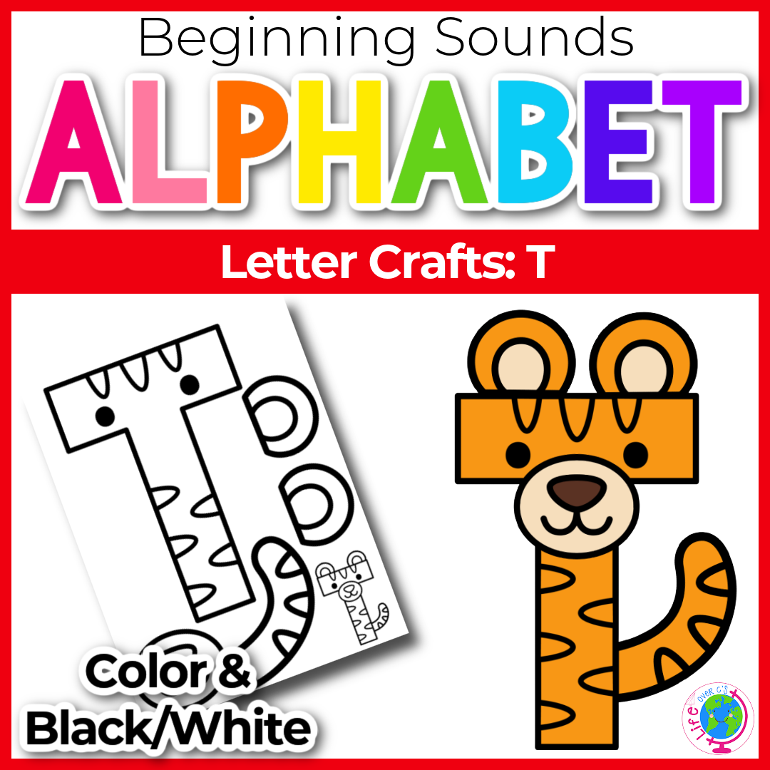 Each uppercase alphabet craft includes a full-color version and a black-and-white version for students to color