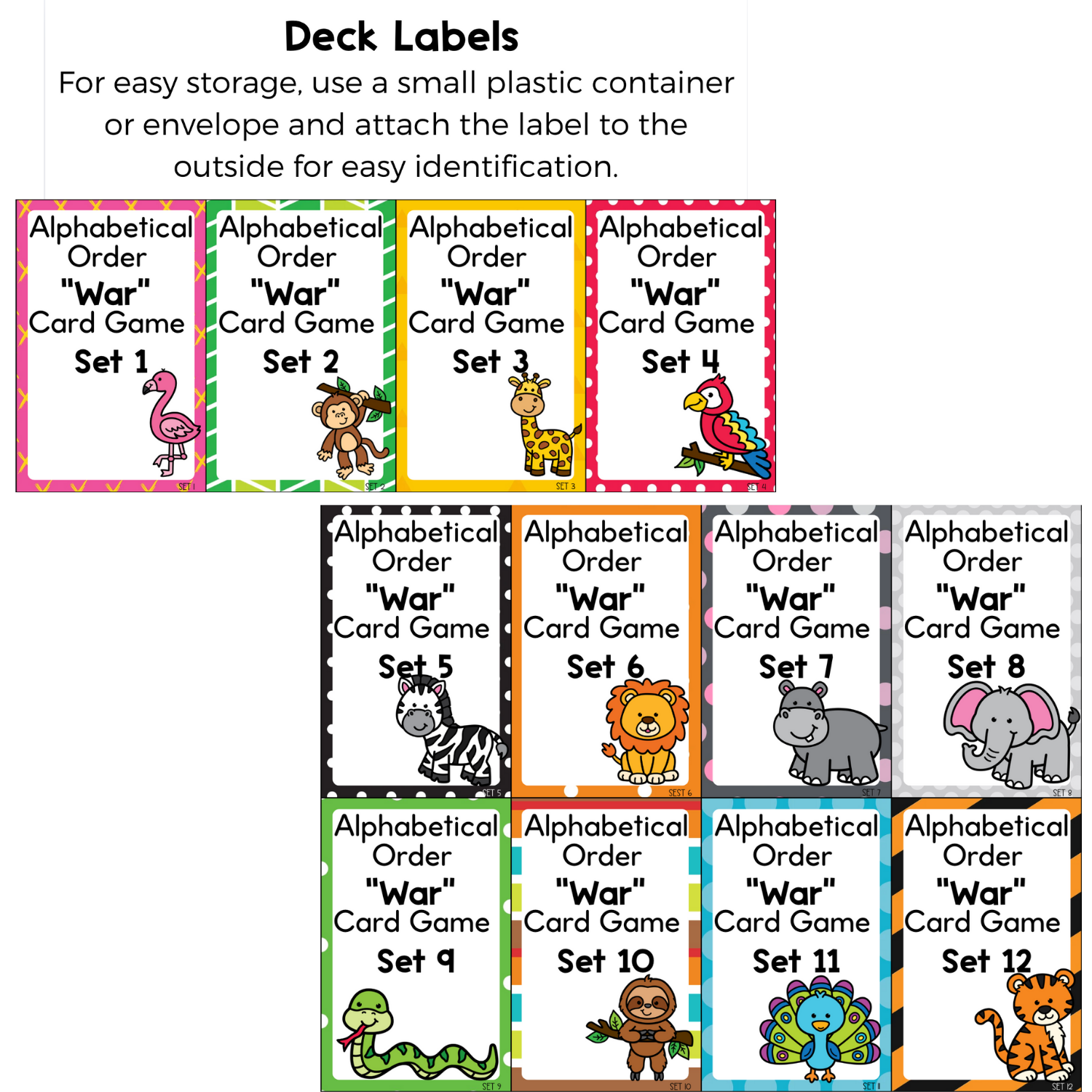 12 ABC order themed decks featuring colorful animal borders and increasing difficulty