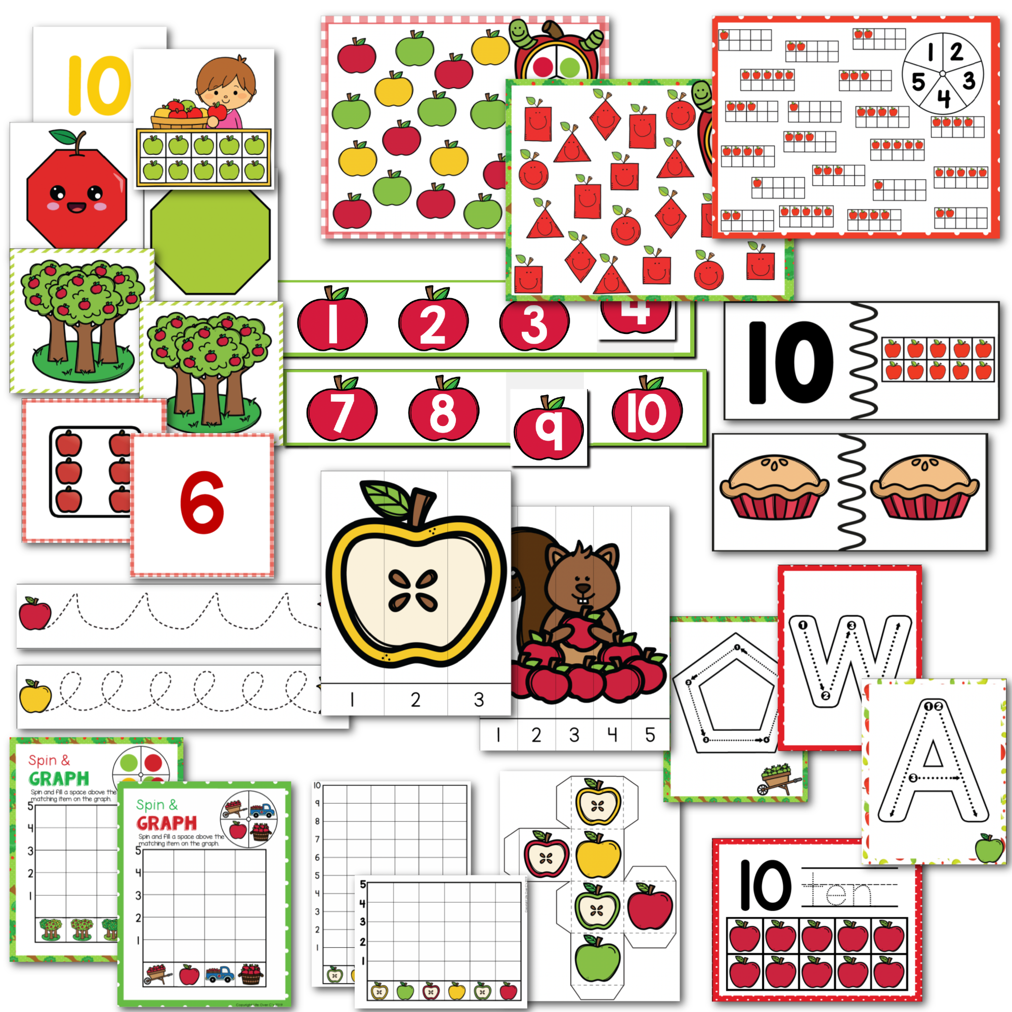 What’s Included in the Apple Theme Preschool Math & Literacy Bundle: