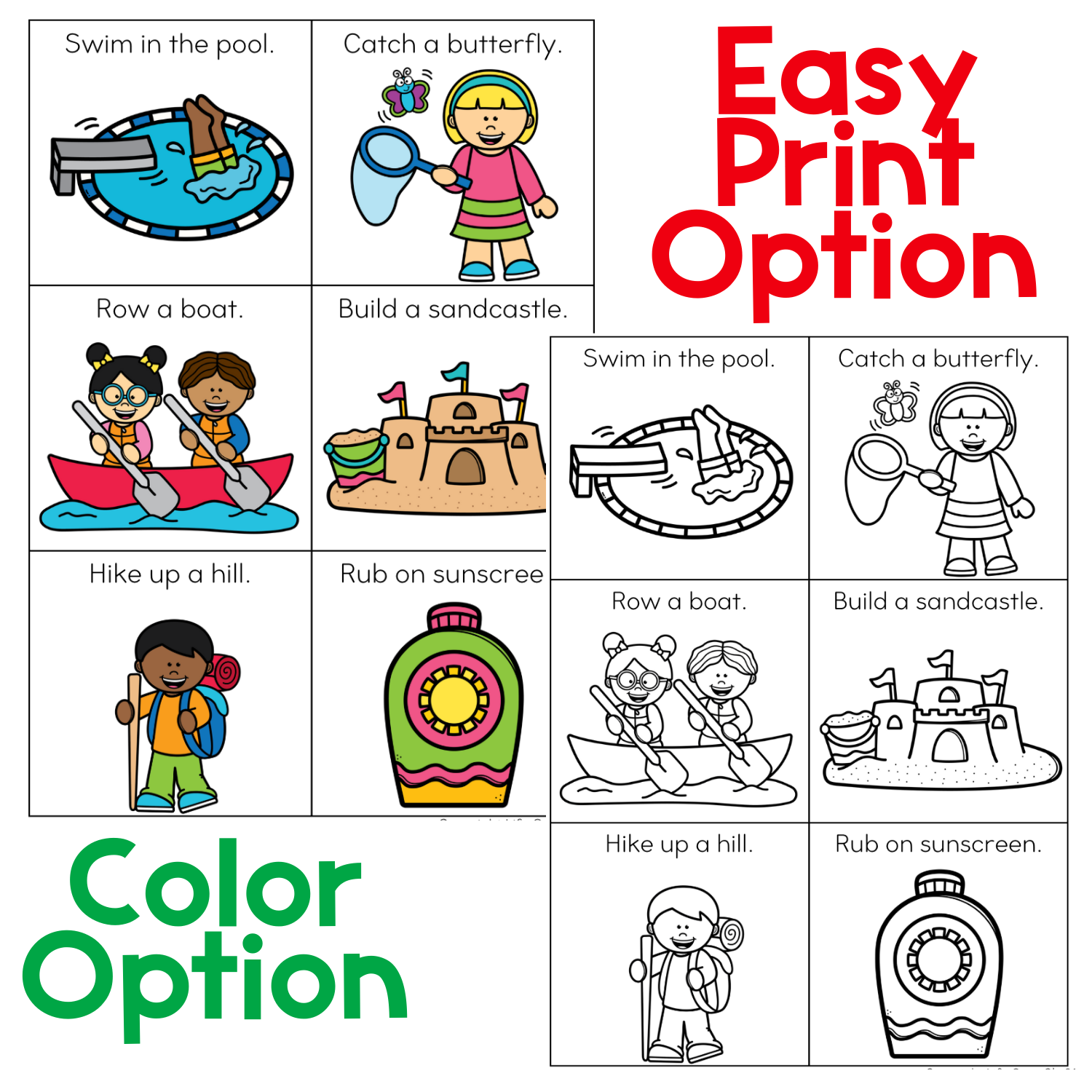 Vocabulary building and thematic learning: Words like “sandcastle,” “butterfly,” and “row a boat” expand vocabulary in a meaningful, summer-themed context.