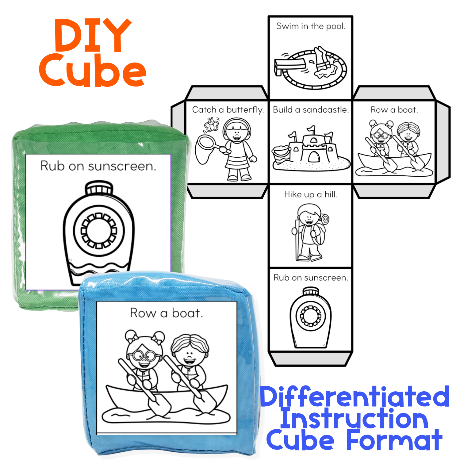 Slide them into a differentiated instruction cube or assemble the DIY cube included.