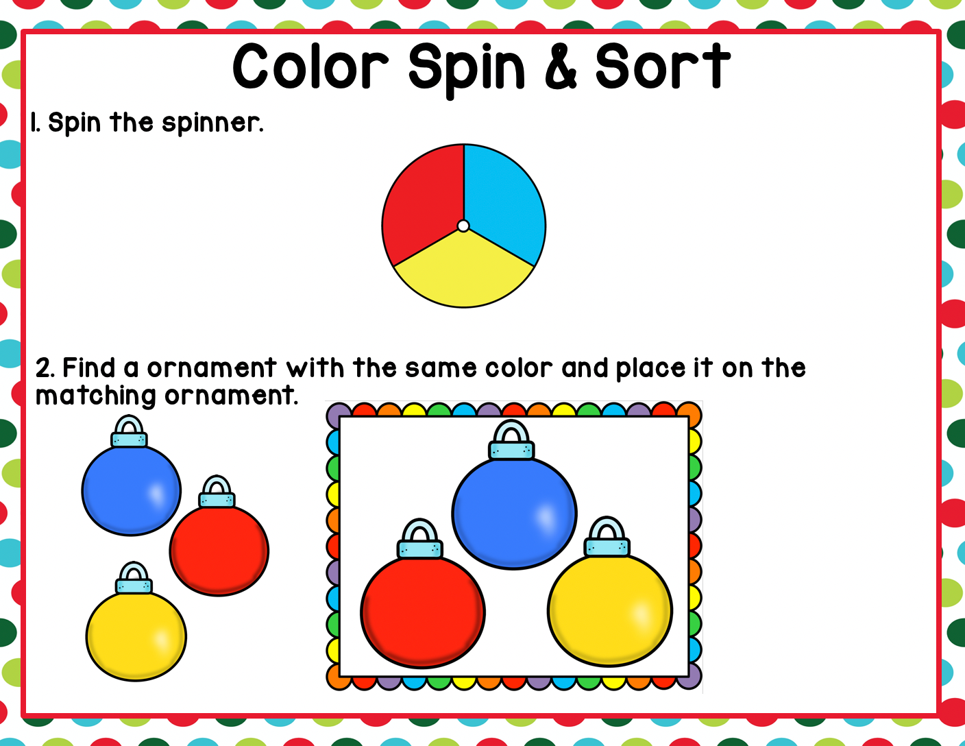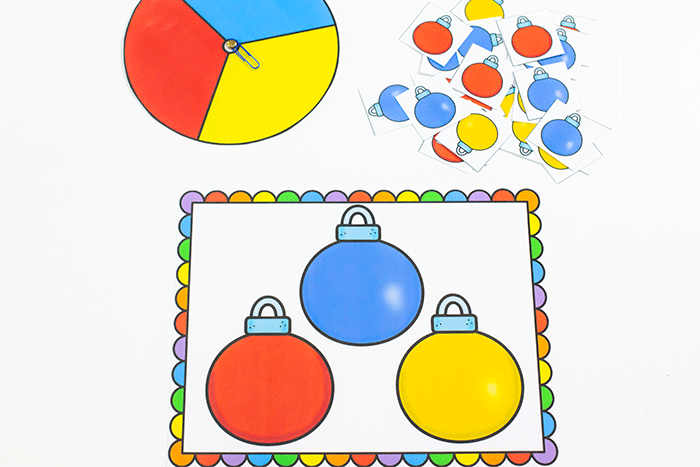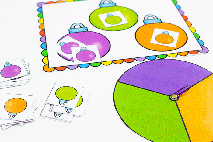 Students spin the spinner, select a matching ornament and place on the correct color on the mat.