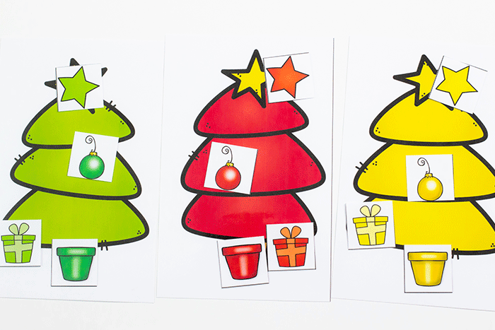 - Match the tree decorations and presents to the Red, Yellow and Green Christmas trees