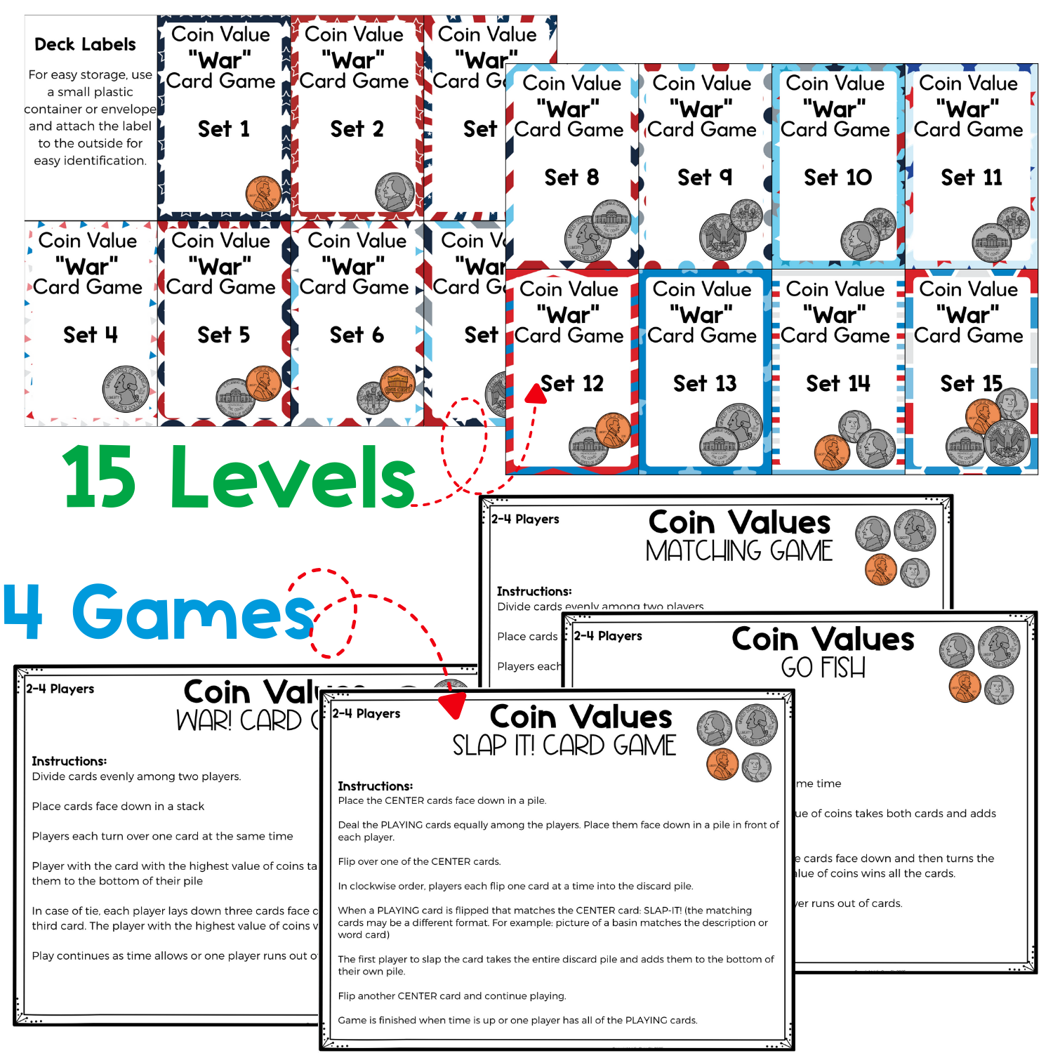 If you want money activities that make counting coins, identifying coins, and building coin value fluency simple and super fun, this complete set of Money Card Games will quickly become one of your most-used math centers all year.