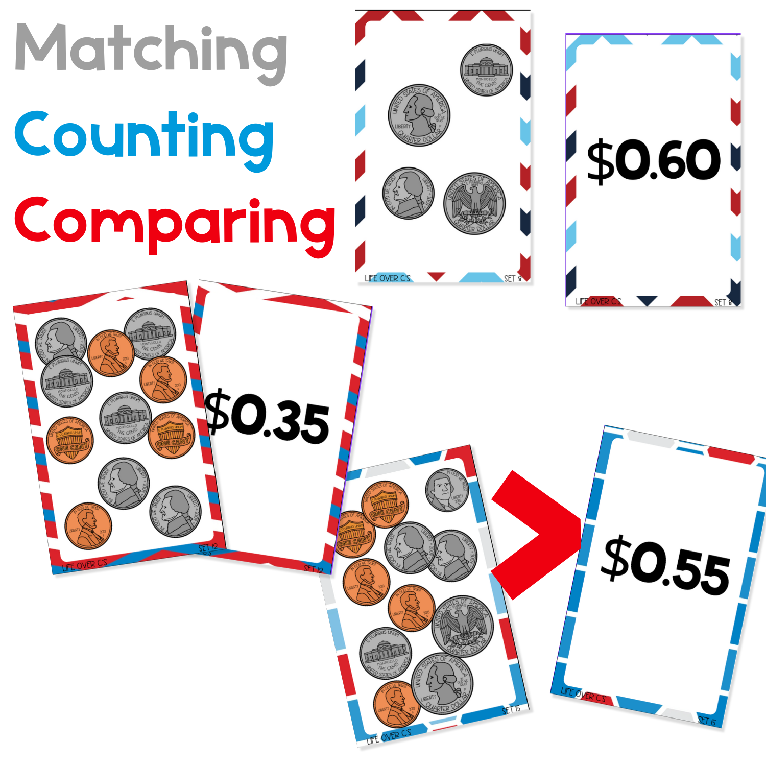 Students match the coin collection card to the written value card. It builds visual discrimination, recognition of coin amounts, and instant recall of money values.