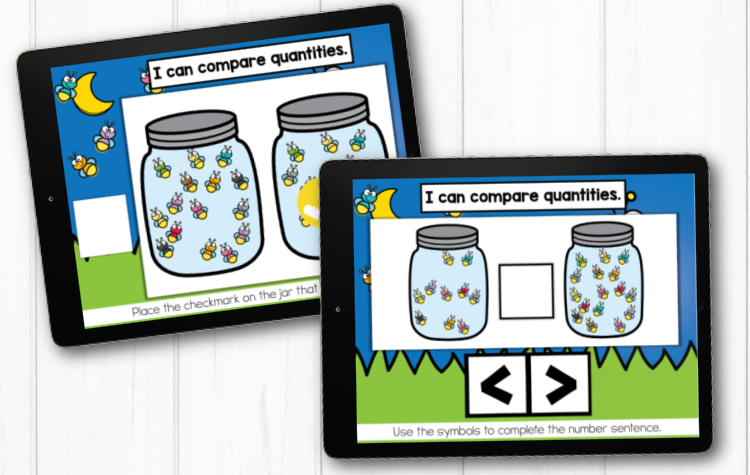 Visual quantity comparison – Adorable firefly jars make comparing groups of objects concrete and engaging, helping learners connect quantities to numbers and build strong one-to-one correspondence skills.