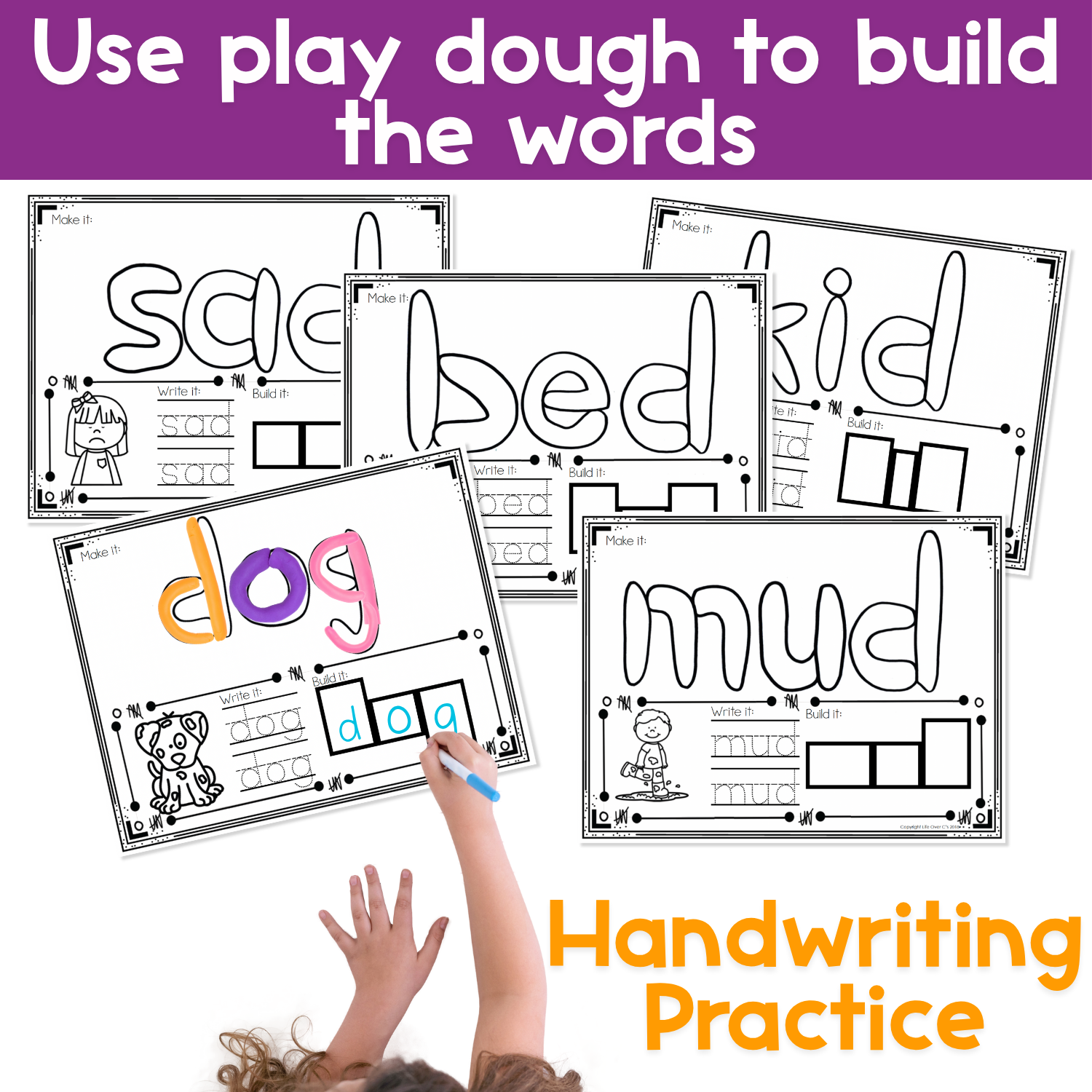 2. Kids roll play dough and shape each letter of the CVC Words in the “Make it” section. Big win for finger muscles!