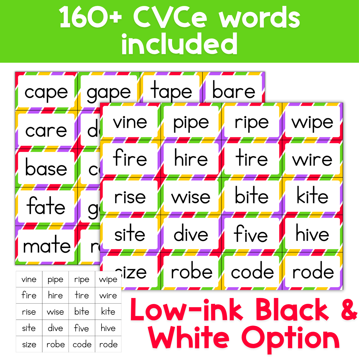 • Over 160 printable CVCe word cards across all five long vowel sounds (a, e, i, o, u)