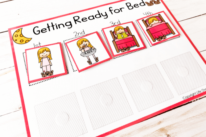 Each routine includes 4-step picture cards to sequence with labeled ordinal positions (1st, 2nd, 3rd, 4th), plus matching mats in full color with adorable illustrations.