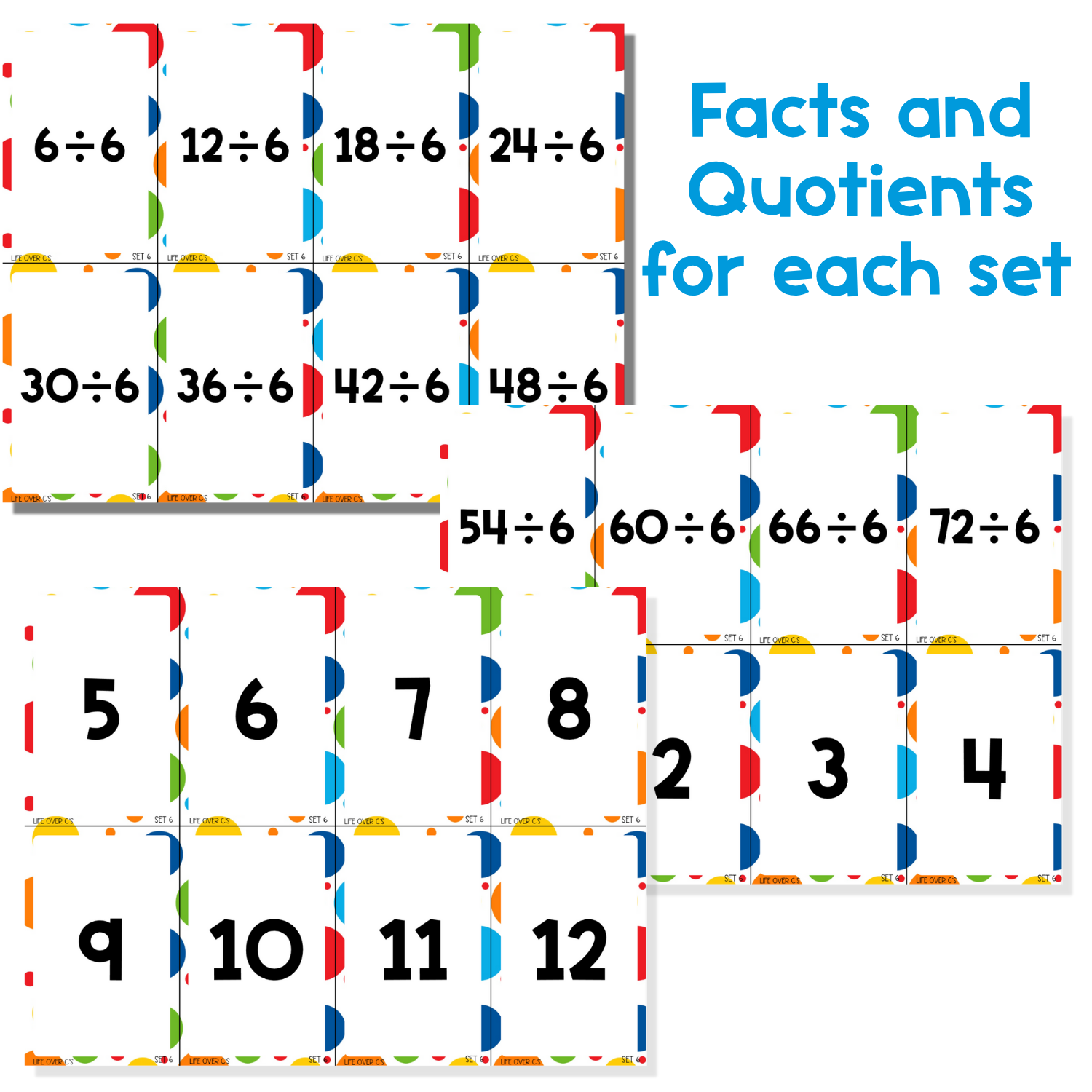- 15 themed sets of division fact cards (1–12, three additional mixed sets)