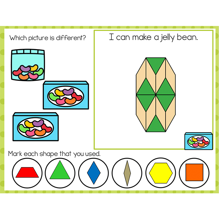 Each mat includes an opportunity to build a picture with matching colors using one-to-one correspondence, selecting images that are different, and identifying 2D shapes.