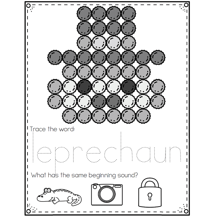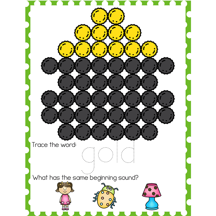 Each mat includes an opportunity to build a picture with matching colors using one-to-one correspondence, tracing words, and finding images that have the same beginning sound.