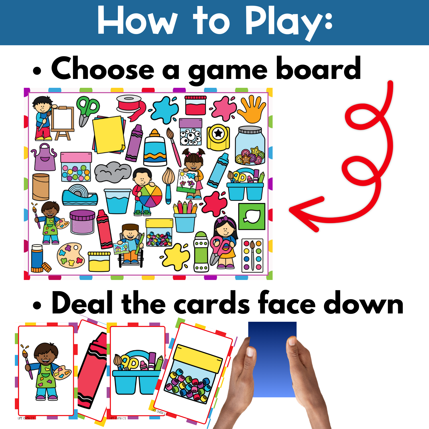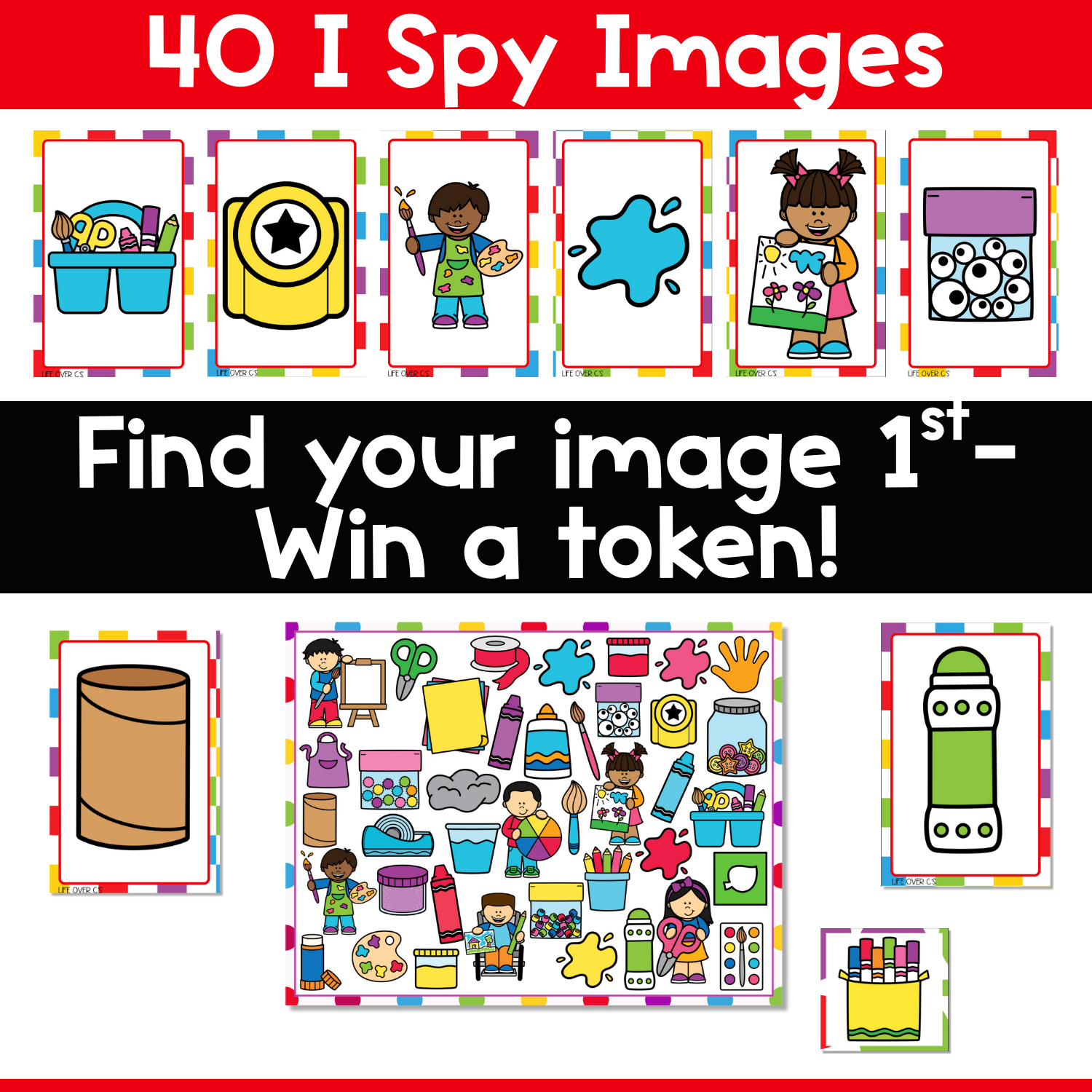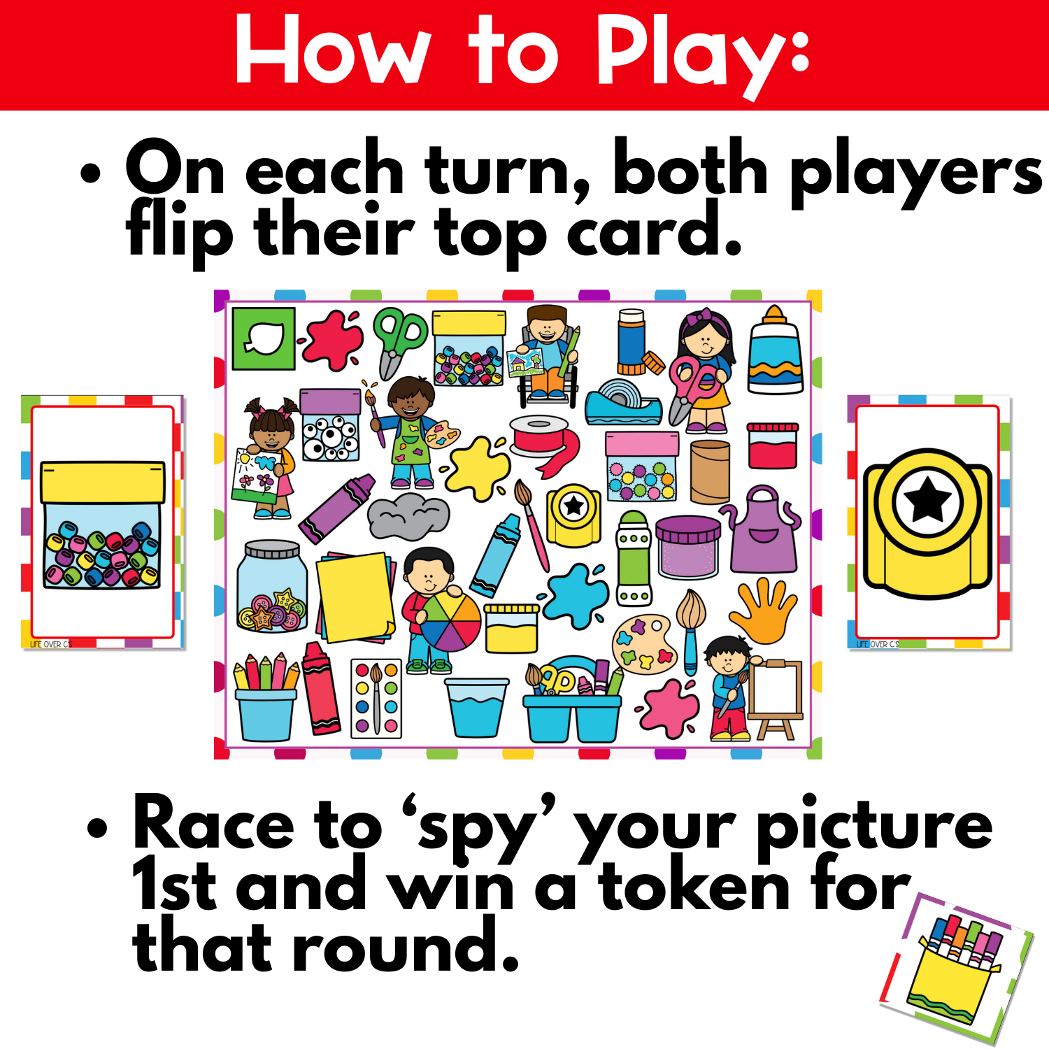40 arts & crafts image cards – Players flip these bright cards to spy the matching picture on their board. Perfect for strengthening vocabulary, articulation, and ELL word recognition in a fun, interactive way.