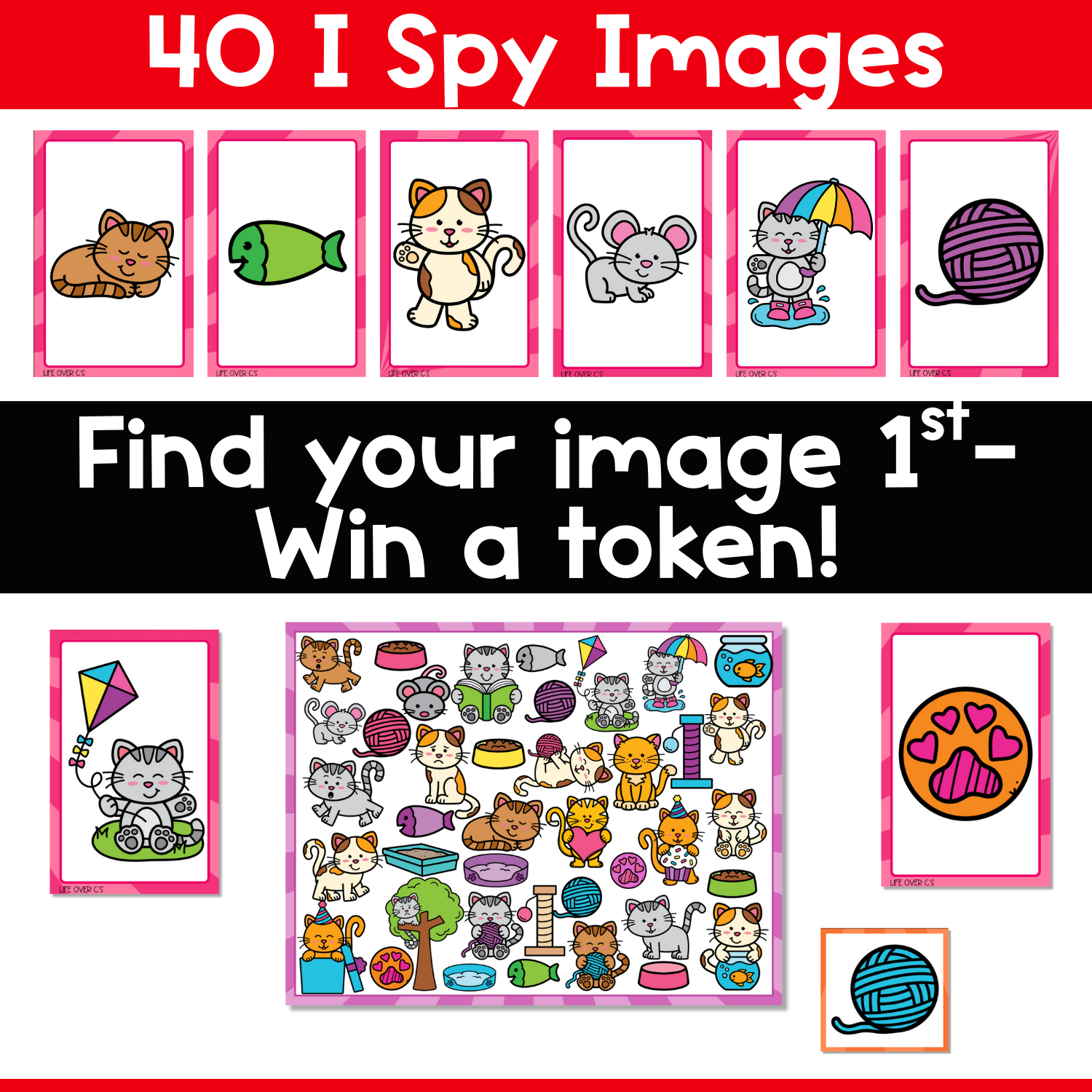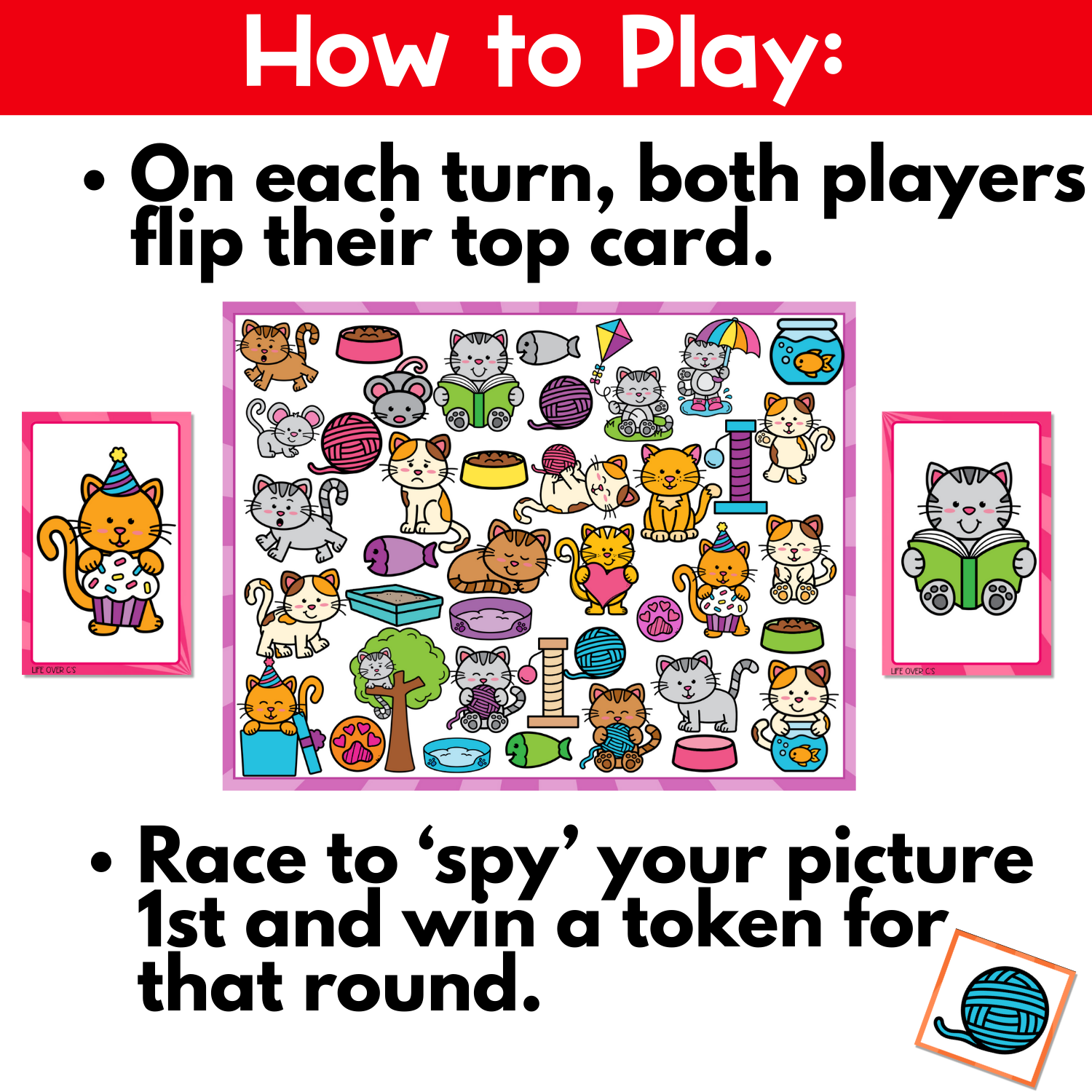 Spy the match – the first player to find the matching cat or pet object on the board wins a token.