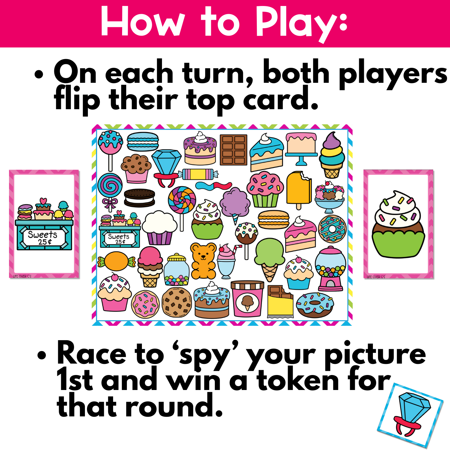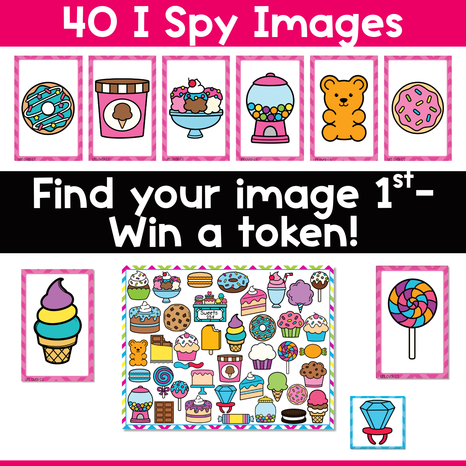 • 40 image cards – Flip these cards to “spy” matching items like cupcakes, gumball machines, lollipops, and donuts. Repeated exposure builds vocabulary, articulation, and word recognition in a hands-on way.