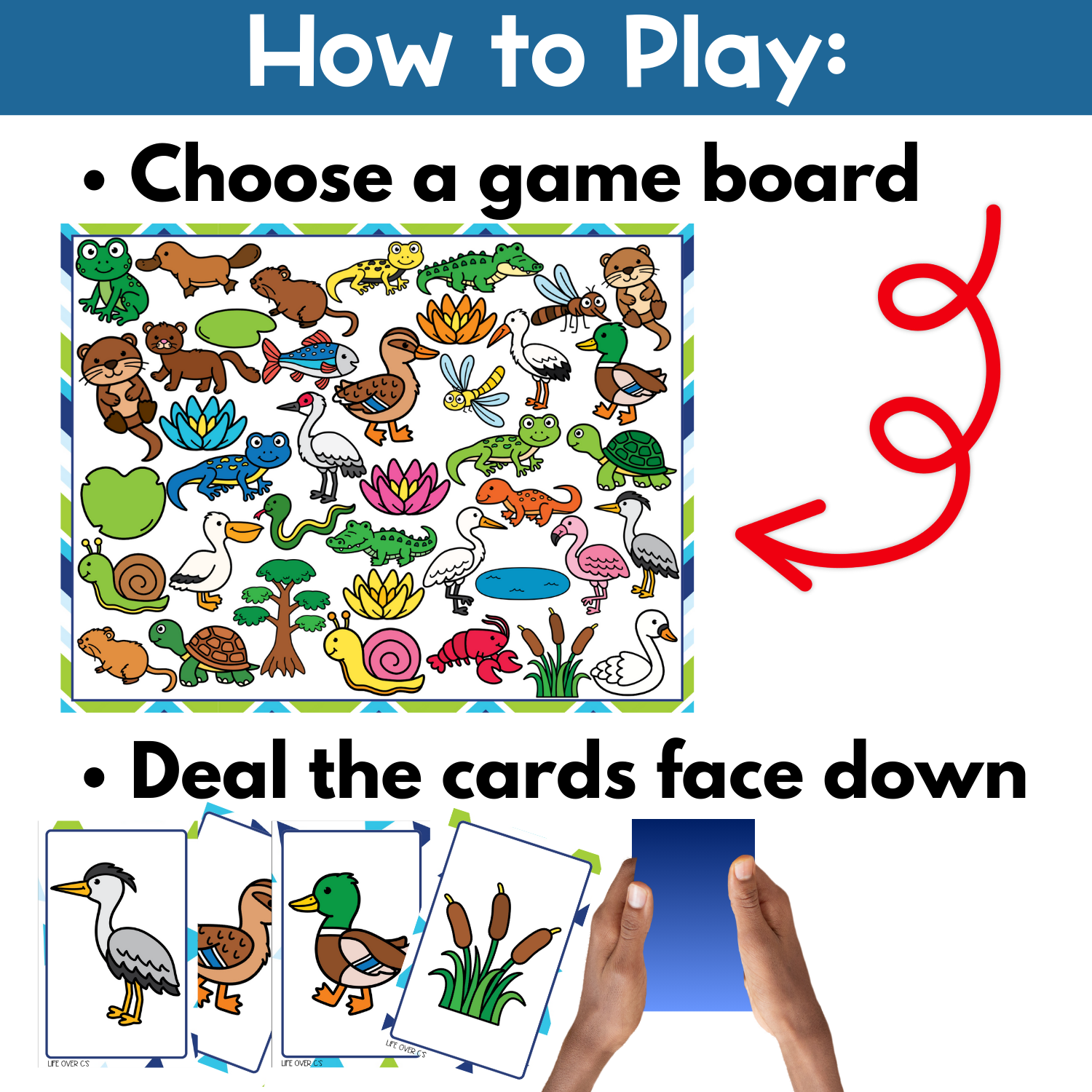 Deal the wetland animal image cards face-down to each player.
