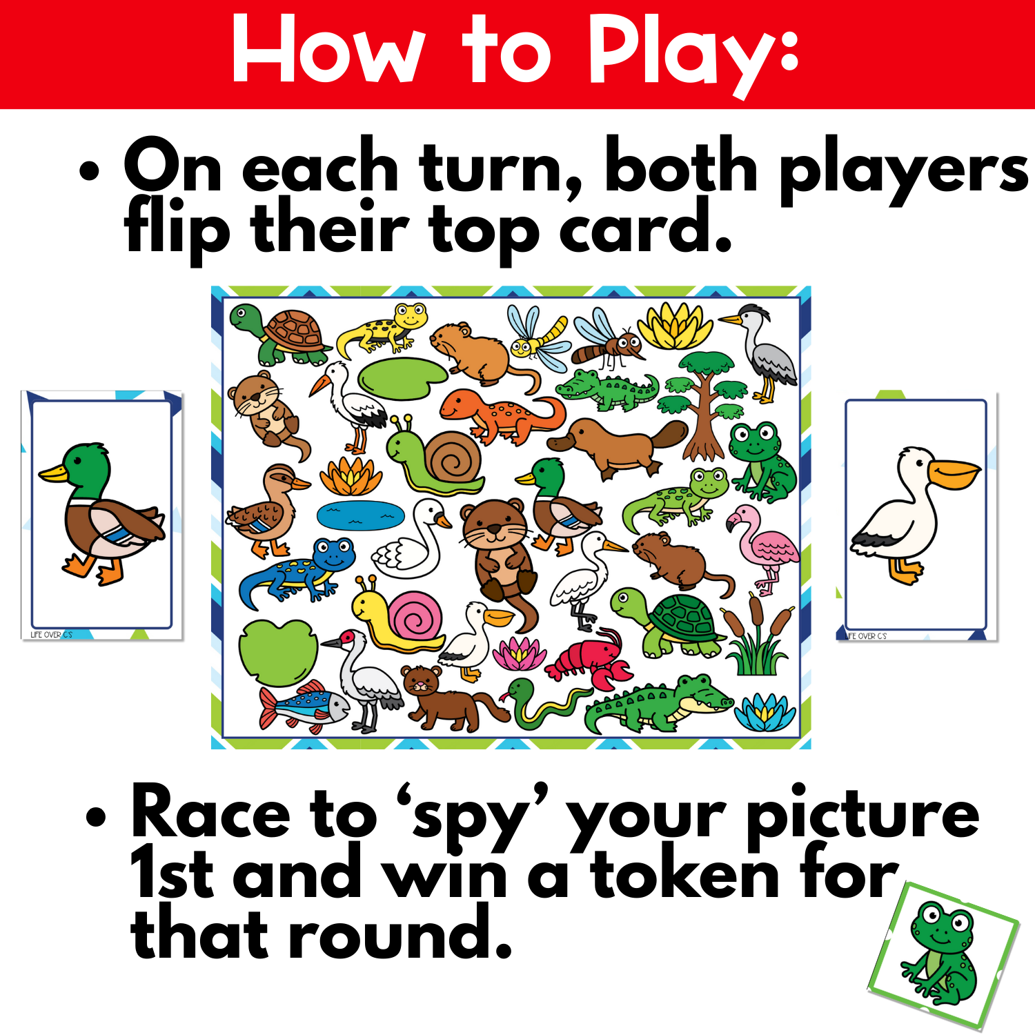 Flip the cards together and race to spy the matching wetland animal on the board.