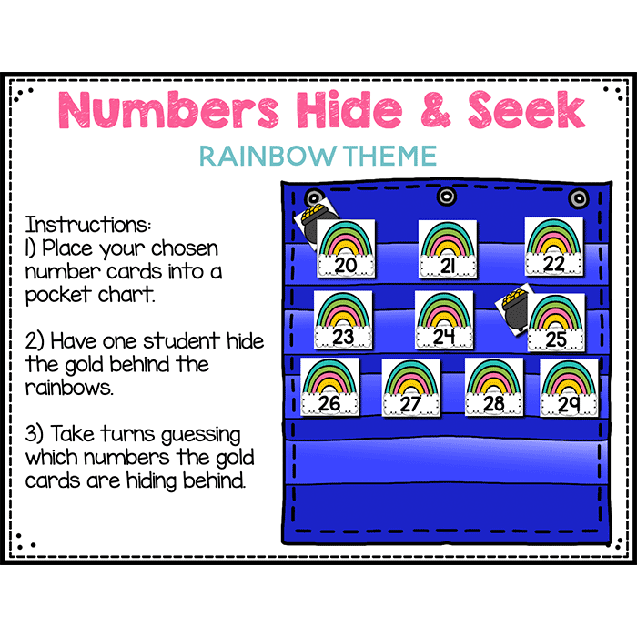 Looking for a fun and engaging small group, whole group or partner activity to teach number recognition? This St. Patrick's Day Rainbow themed number hide and seek pocket chart game is the perfect way to work on number recognition in preschool, Pre-k, and kindergarten. Perfect for any time of the year! Covering all numbers from 0-120, this is great for differentiating.