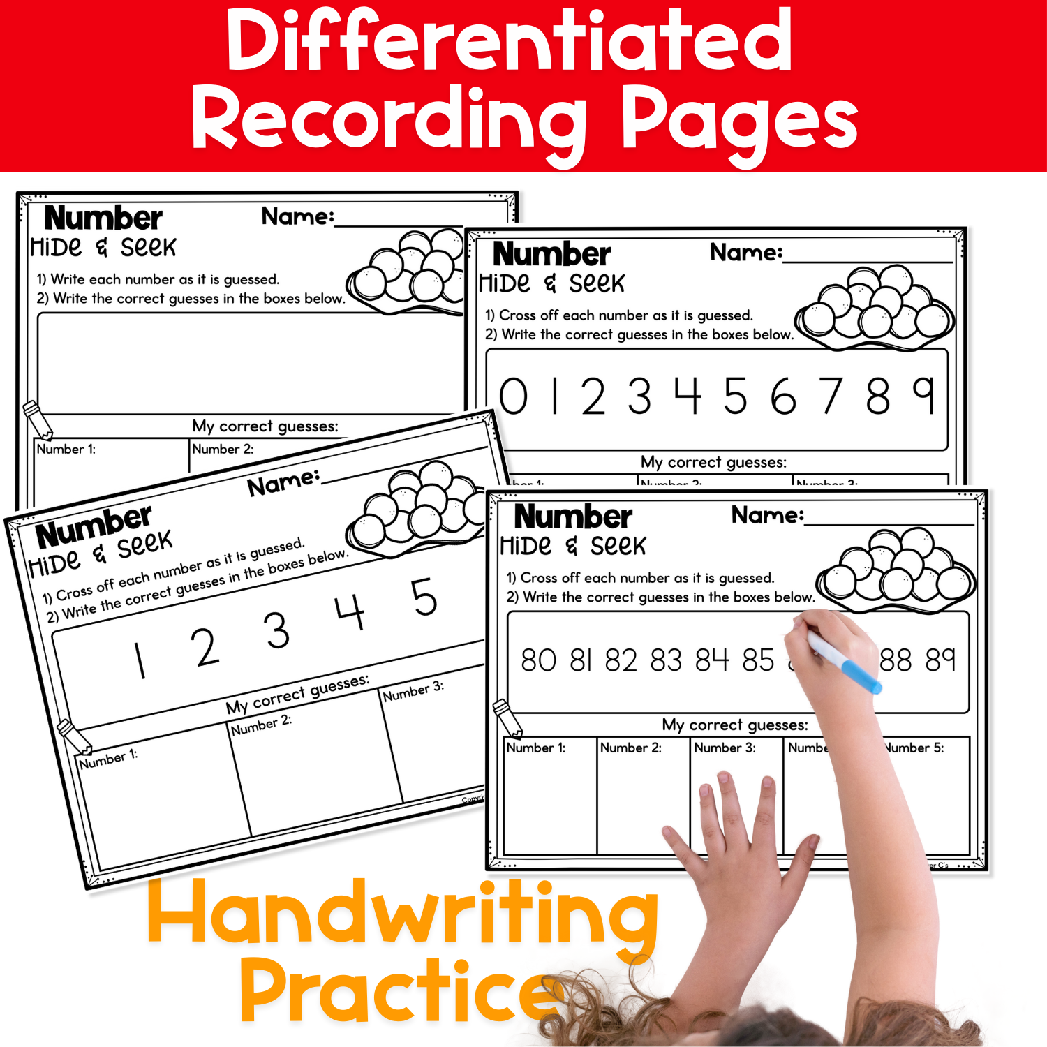 Use the recording pages to cross off guessed numbers and write the correct numbers when hats are found.
