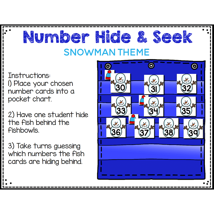 Looking for a fun and engaging small group, whole group or partner activity to teach number recognition? This snowman themed number hide and seek pocket chart game is the perfect way to work on number recognition in preschool, Pre-k, and kindergarten. Perfect for any time of the year! Covering all numbers from 0-120, this is great for differentiating.