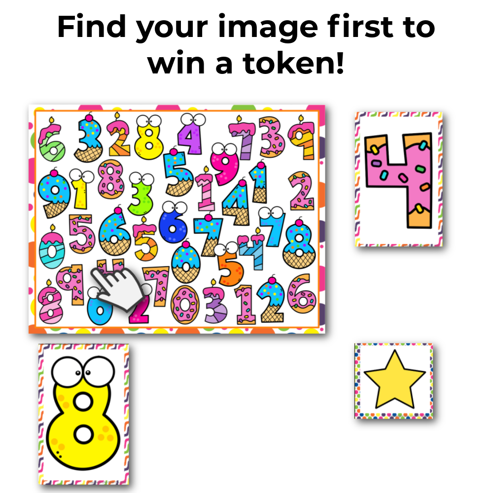 Students are dealt an equal number of cards which lay face down on the table. For each round, kids flip their top card over at the same time and then search the I Spy board to find the picture on their I Spy card.