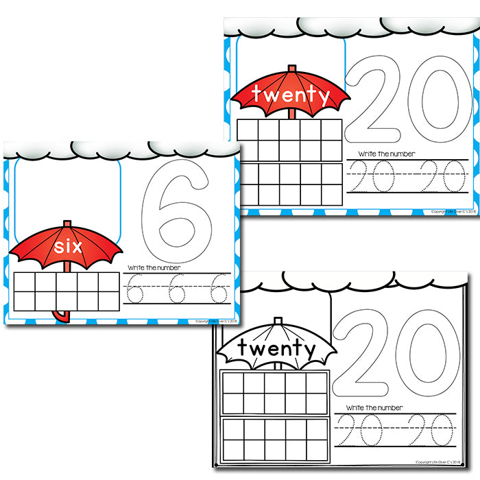 The spring counting number mats come in three different variations. There are number mats with filled ten-frames, number mats with empty ten-frames, and spring counting cards without ten-frames. Each variation includes the numbers from one to twenty.