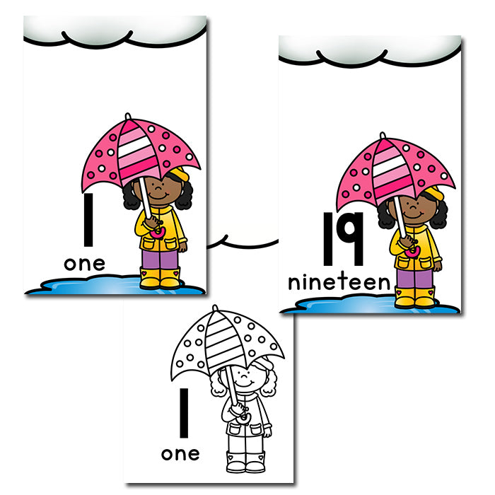 Using small blue objects such as pom poms or glass vase filler, show the correct number of “raindrops” above each umbrella.