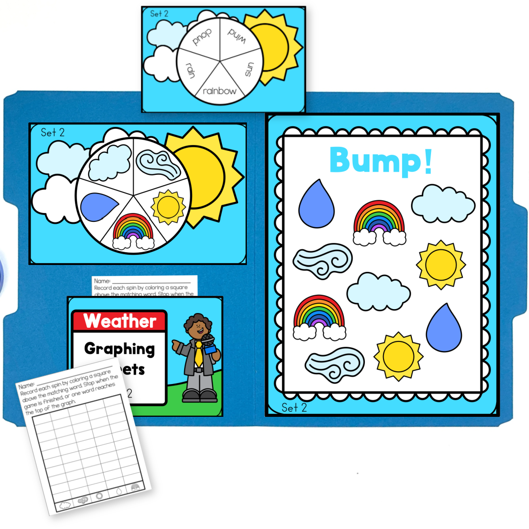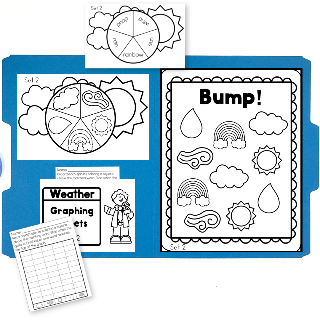 4 unique weather Bump! games in full color and the elements to turn them into file folder games. (Cover with instructions, tab label, spinner, game board, pocket for Spin & Graph sheets).