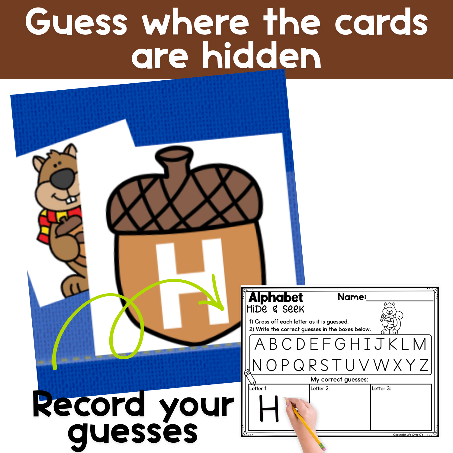 Students search for playful squirrels hidden behind acorn alphabet cards as they guess, reveal, and record letters during this interactive alphabet pocket chart game.