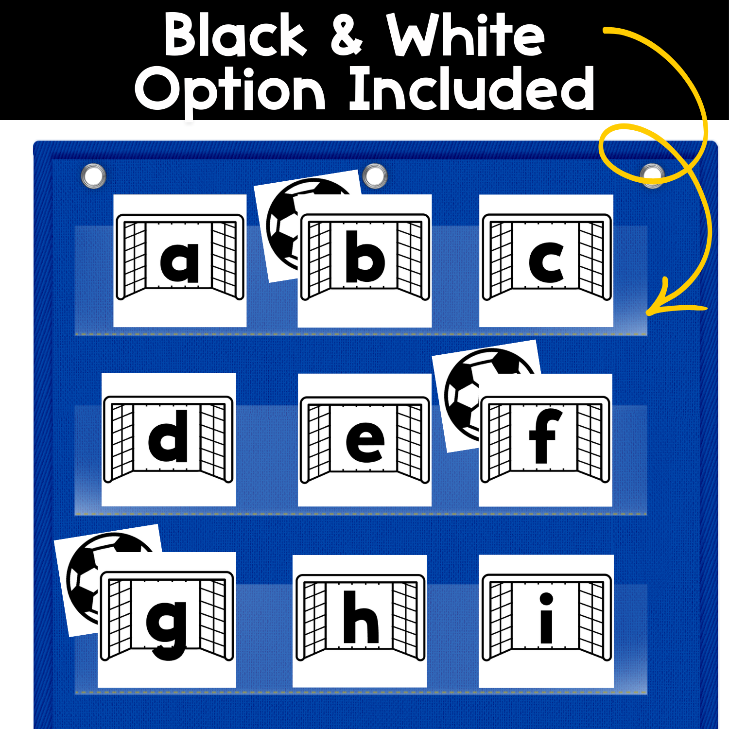 • Lowercase alphabet soccer goal cards in black and white