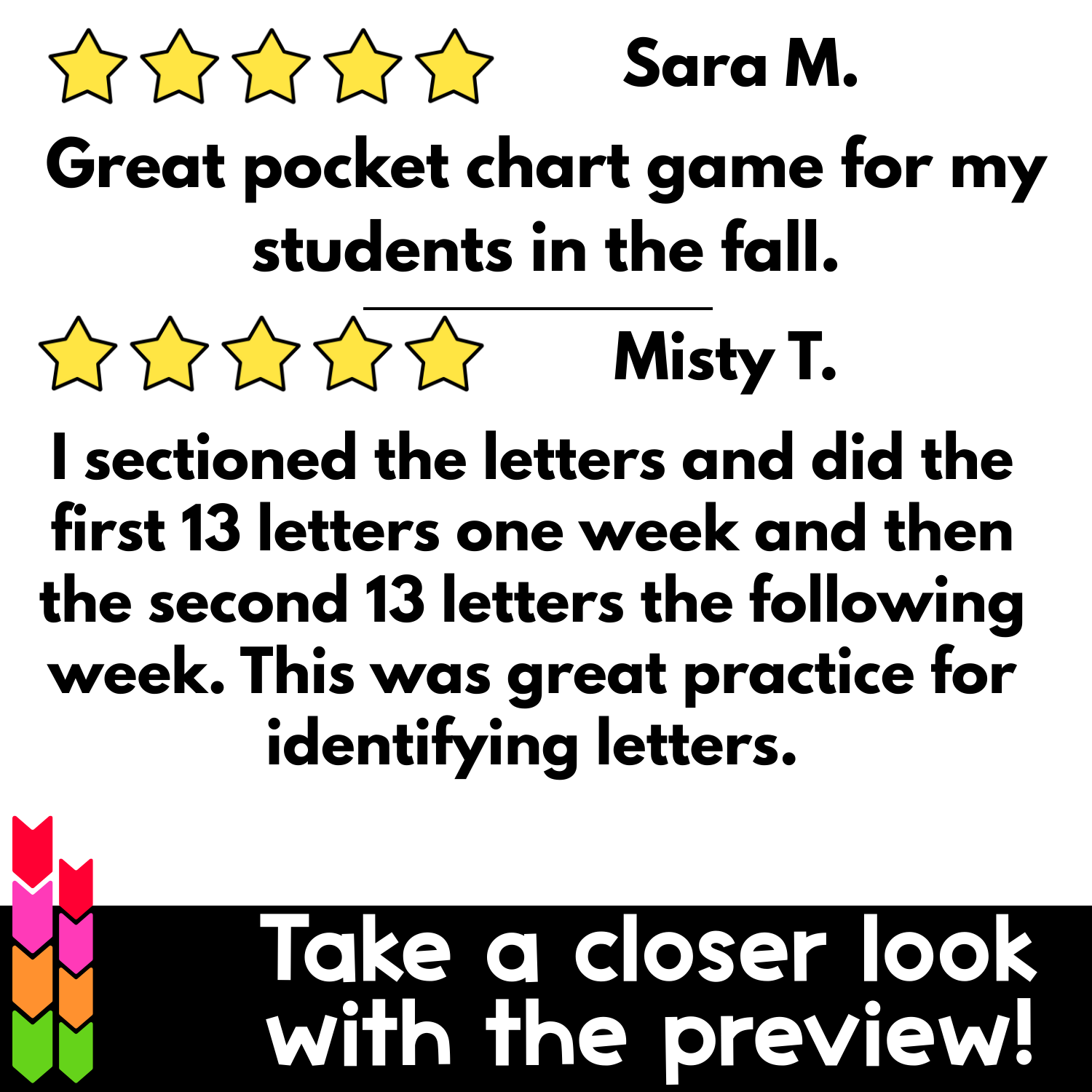 ⭐️⭐️⭐️⭐️⭐️ Sandra Carpentieri (TPT Seller) wrote, “GREAT way for students to interact with letters in a fun and engaging way! We use this for both whole group instruction as well as adding this to my workstation rotation.”