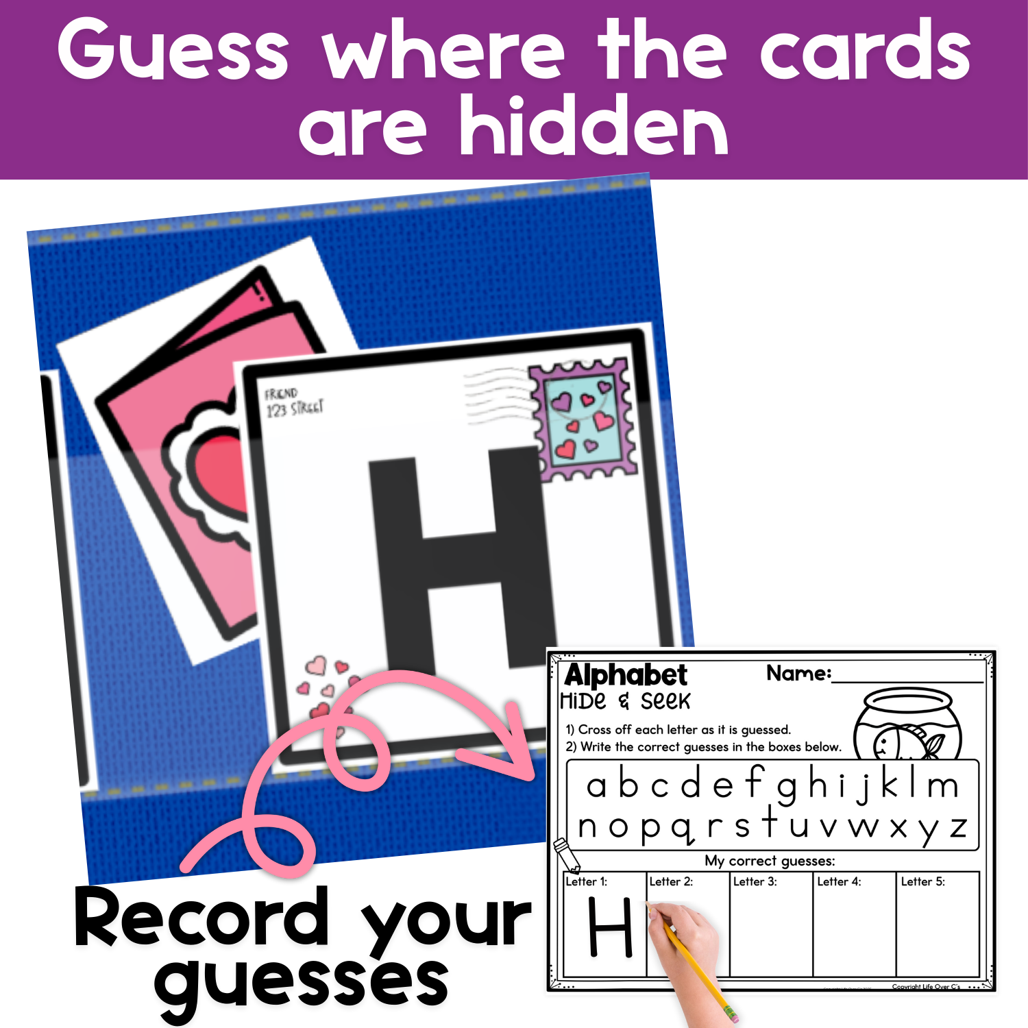 This Valentine-themed alphabet recognition literacy game turns uppercase and lowercase letter practice into an interactive guessing game.