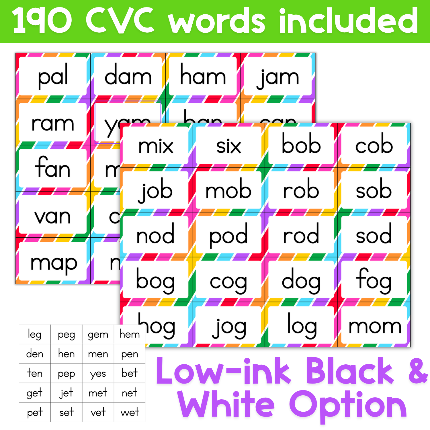 190 printable CVC word cards across all five short vowel families (a, e, i, o, u)