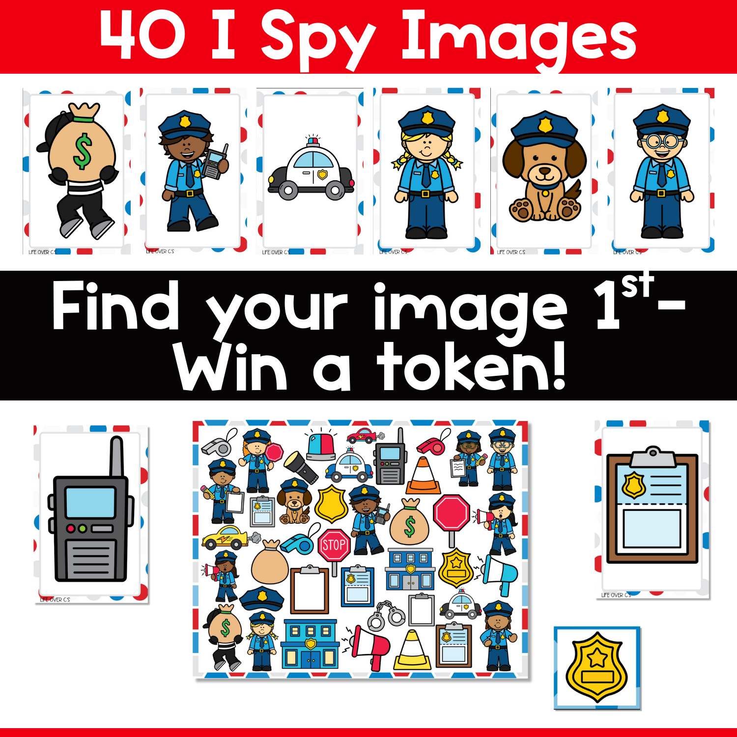 • 10 colorful I Spy game boards featuring engaging police and community helper scenes