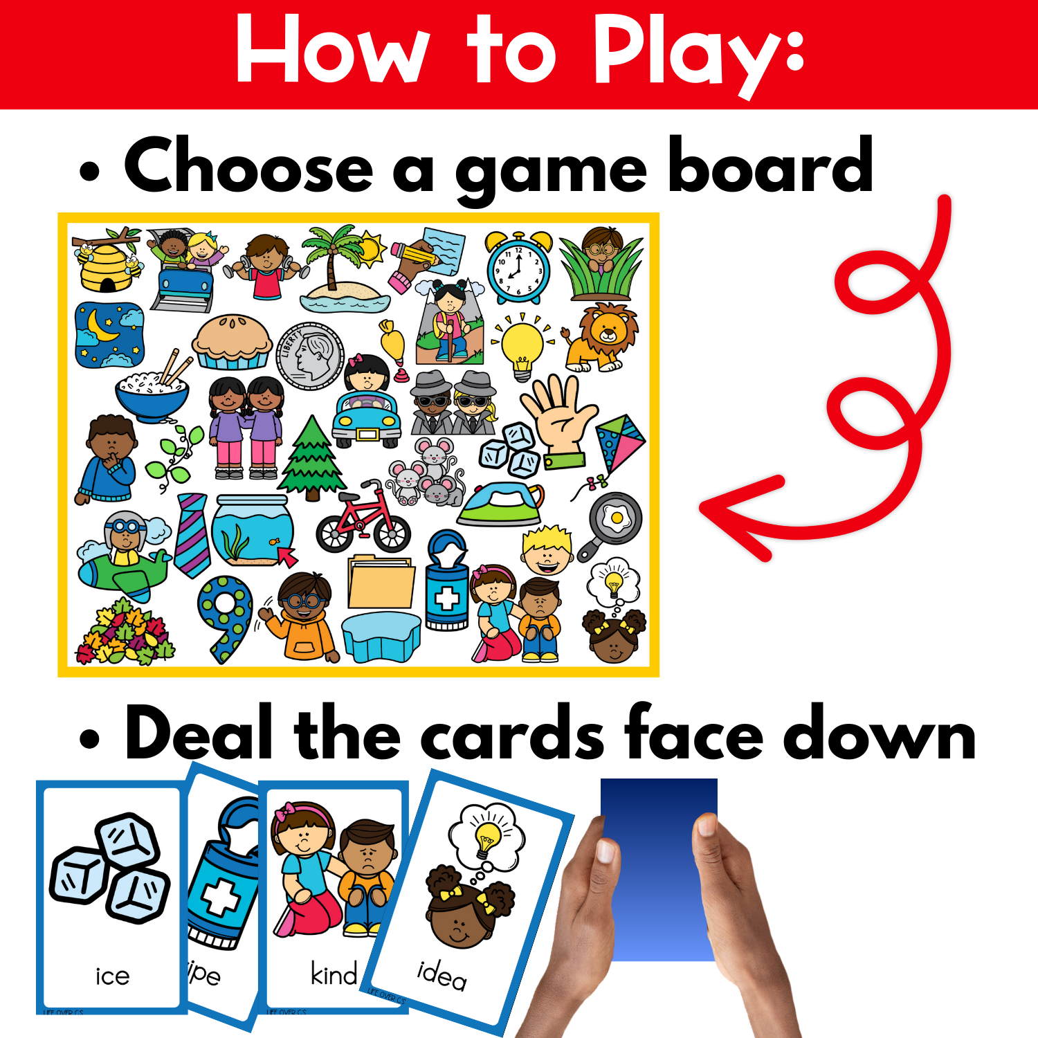 2. Set it up: Choose one long Vowel 'I' I Spy game board and place it in the center. Deal image cards to each player.