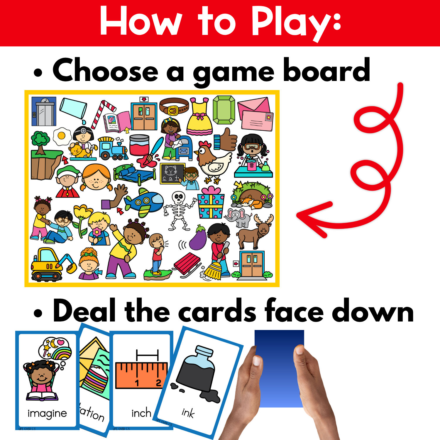 Set Up: Choose one game board and give each student a small deck of image cards.