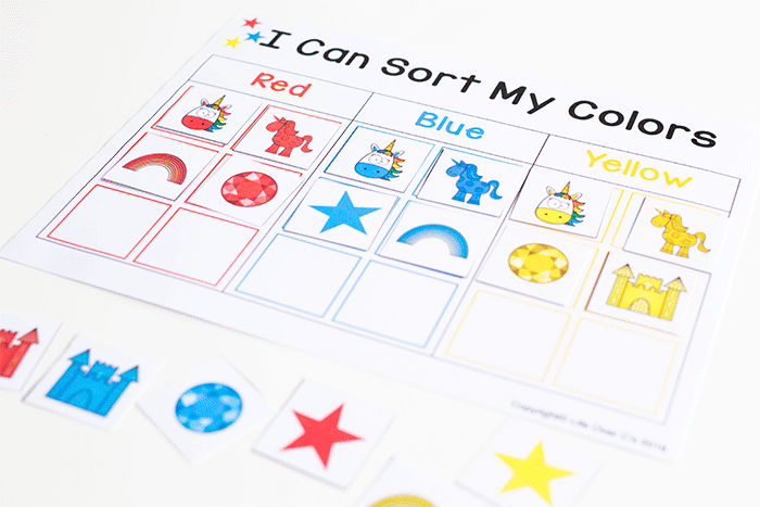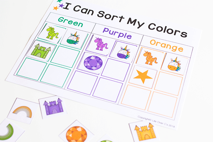 Unicorn Sorting Mats: Sort colorful objects like gems, castles, rainbows, and unicorns into primary and secondary color groups. Two levels of mats are included... one with color prompts and one without for extra challenge.